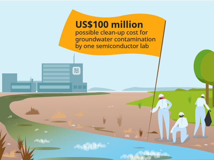 Compounds involved in semiconductor production include hydrofluoric acid for cleaning and etching photosensitive components and ammonia, ammonium fluoride, hydrogen peroxide and hydrochloric, sulfuric and phosphoric acids, which are used for rinsing. Washing the semiconductor wafers is the most water intensive part of the process and produces fluorine-rich wastewater that requires neutralising with lime.