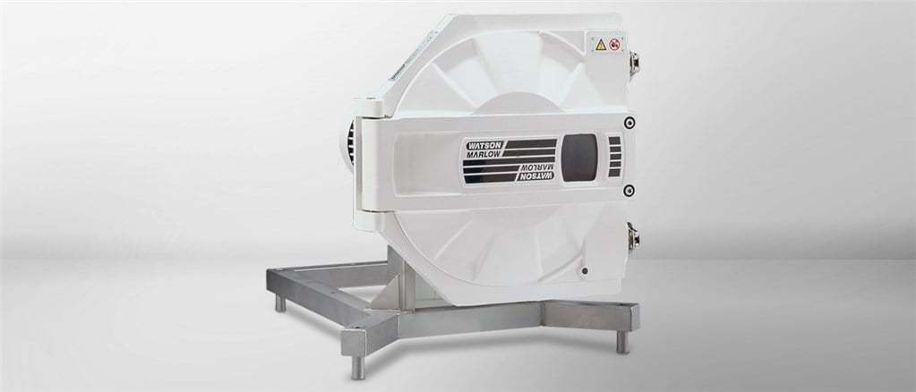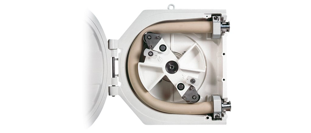 设计用于低切卫生泵的职责to 8,140 L/h (35 GPM) and pressures up to 3.5 bar (50 psi) in the biotechnology, pharmaceutical and food industries, 800 series pumps feature a true CIP (clean-in-place) and SIP (steam-in-place) facility. The twin stainless steel rollers disengage to lift off the USP Class VI Bioprene or GORE STA-PURE PCS tube, allowing a straight-through path for cleaning. There are no "dead spots" or crevices. Mounted on a steel frame, 800 series pumps are available with fixed speed motor gearboxes or inverter-rated variable speed motor gearboxes providing 4-20 mA or 0-10 V process control, as well as remote stop/start and reverse.